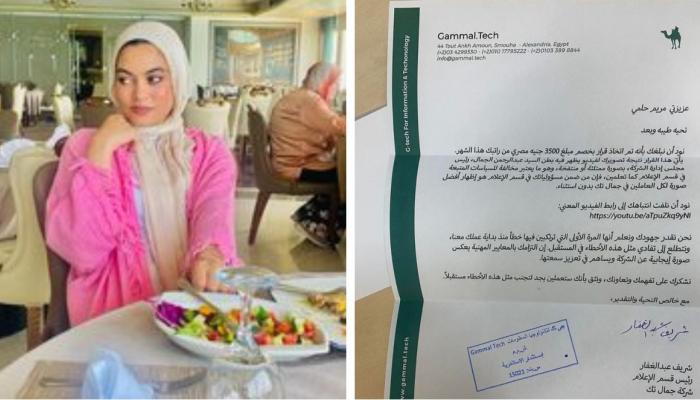 ونص خطاب الشركة على: “عزيزتي مريم حلمي.. نود أن نبلغك بأنه تم اتخاذ قرار بخصم مبلغ 3500 جنيه من راتبك هذا الشهر، ويأتي هذا القرار نتيجة تصويرك لفيديو يظهر فيه بطن السيد عبدالرحمن الجمال، رئيس مجلس إدارة الشركة، بصورة ممتلئة أو منتفخة”.