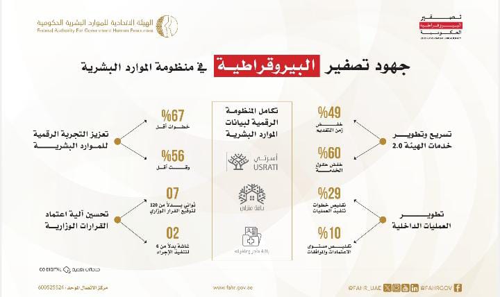 وضمن جهودها لتصفير البيروقراطية راجعت الهيئة 23 عملية خاصة بإجراءات الموارد البشرية، بالتعاون مع الشركاء في الجهات الاتحادية، وحدثت دليل إجراءات الموارد البشرية في الحكومة الاتحادية.