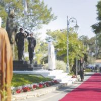 كما وضع سموه خلال المراسم إكليلا من الزهور على النصب التذكاري لمكاريوس الثالث الرئيس المؤسس لجمهورية قبرص.