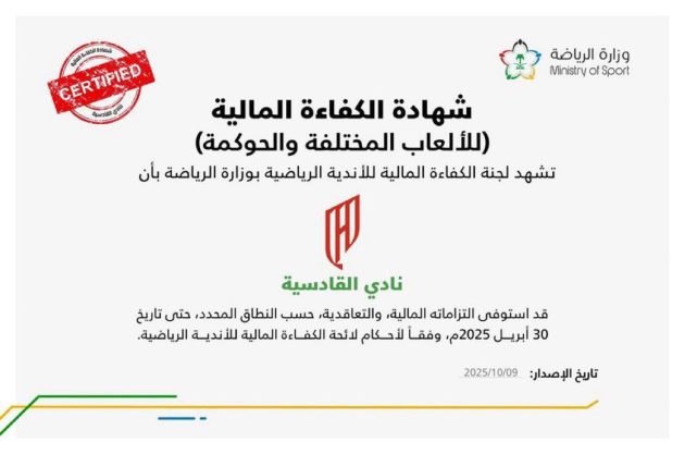 وتُعد هذه الشهادة تأكيدًا على التزام نادي القادسية بتطبيق أعلى معايير الانضباط المالي والإداري، وحرصه على تحقيق التوازن بين الأداء الرياضي والحوكمة الفاعلة، بما يضمن استمرار تطوير منظومة الألعاب المختلفة داخل النادي وفق أسس احترافية ومستدامة.