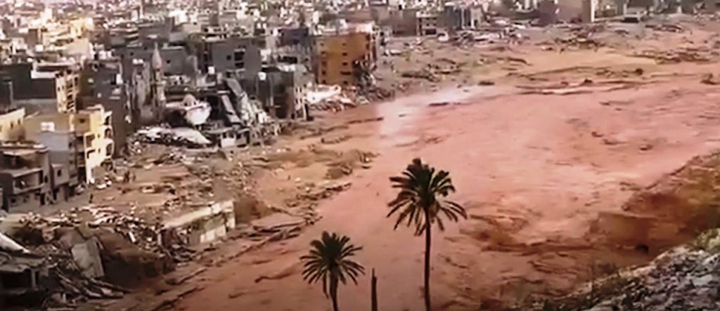 وبعد يومين فقط من كارثة زلزال المغرب، ضرب الجار الليبي «إعصار دانيال» مصحوبًا برياح قوية وأمطار غزيرة أدت إلى فيضانات هائلة وانهارت السدود والبنية التحتية لاسيما بمدينتي درنا والبيضاء، في مشهد دمار غير مسبوق بالبلاد، حصد نحو ٤ آلاف قتيل علاوة على عشرات الآلاف من المفقودين الذي يُعتقد أن مياه الفيضانات قد جرفتهم إلى البحر.