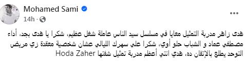 وكتب محمد سامي في منشور عبر حسابه الشخصي بموقع فيس بوك: «هدى زاهر مدربة التمثيل معايا في مسلسل سيد الناس عاملة شغل عظيم».