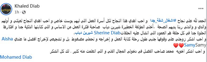 كتب خالد دياب في منشور عبر حسابه الشخصي بموقع فيس بوك: «الحمدلله على نجاح أشغال شقة جدًا وأحب أهدي هذا النجاح لكل أسرة العمل اللي ليهم بوست خاص وأحب أهدي النجاح لعيلتي وأولهم والدي ووالدتي ربنا يديهم الصحة».