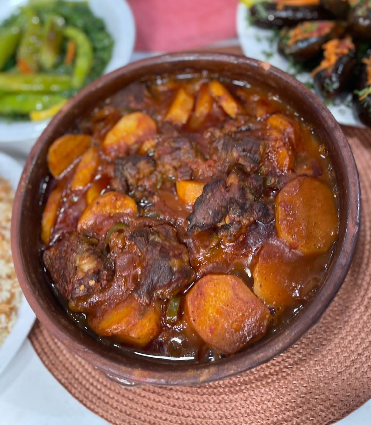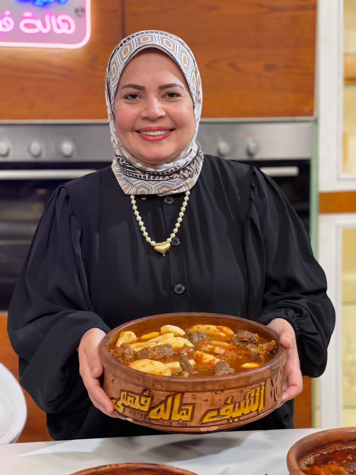 وأكملت: «يتم إحضار طاجن ويتم وضع البطاطس وأعلاها اللحمة المسلوقة و الصلصة ويمكن زيادتها بالشوربة ثم تغطية الطاجن ووضعه على الفرن لكي يحصل على التسوية المناسبة».