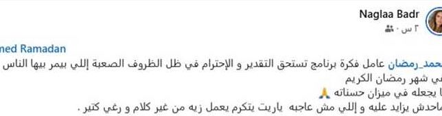 وكتبت نجلاء بدر في منشور عبر حسابها الشخصي بموقع فيس بوك: «محمد رمضان عامل فكرة برنامج تستحق التقدير والاحترام في ظل الظروف الصعبة اللي بيمر بها الناس وفي شهر رمضان الكريم».