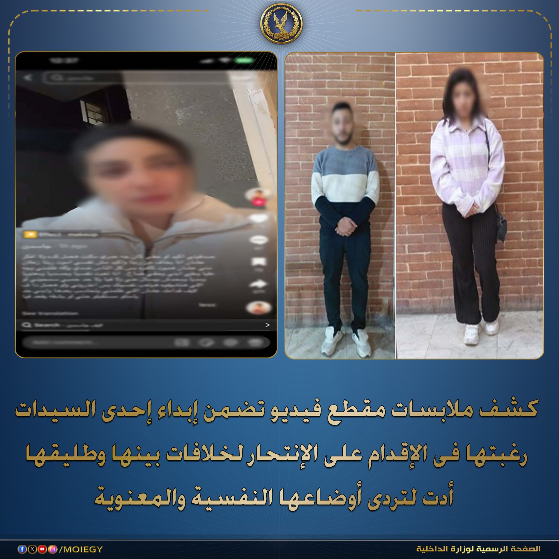 كشفت الأجهزة الامنية بوزارة الداخلية ملابسات مقطع فيديو تم تداوله بمواقع التواصل الإجتماعى تضمن إبداء إحدى السيدات رغبتها فى الإقدام على الإنتحار لخلافات بينها وطليقها أدت لتردى أوضاعها النفسية والمعنوية.