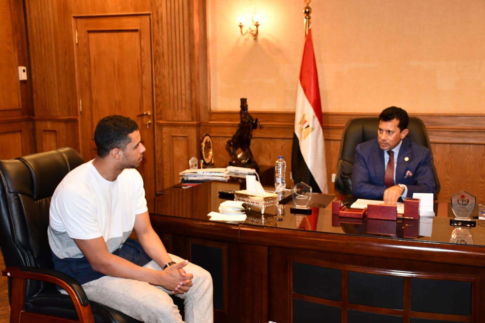 وزير الرياضة يلتقي لاعب المنتخب المصري للإسكواش مصطفى عسل