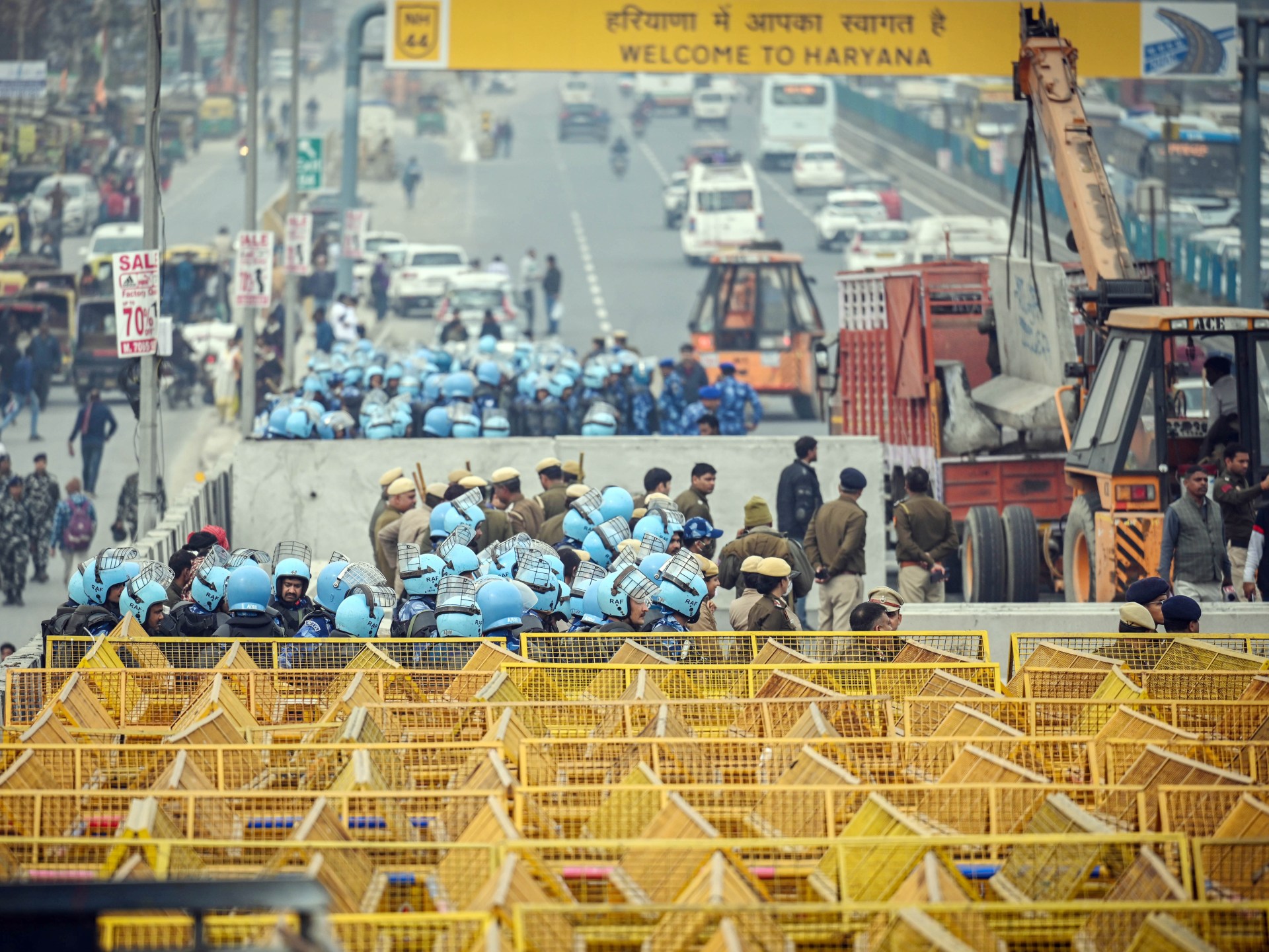 Police sealed multiple entry points into New Delhi by erecting barriers of barbed wire, spikes and cement blocks. Large gatherings in the capital have been banned and internet services suspended in some districts of the neighbouring Haryana state.