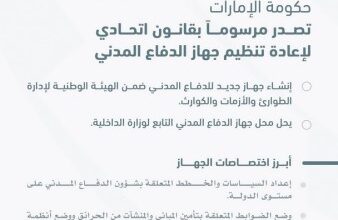 أصدرت حكومة الإمارات مرسوماً بقانون اتحادي بشأن إعادة تنظيم جهاز الدفاع المدني، بهدف تعزيز جاهزية الدولة للتعامل مع…
