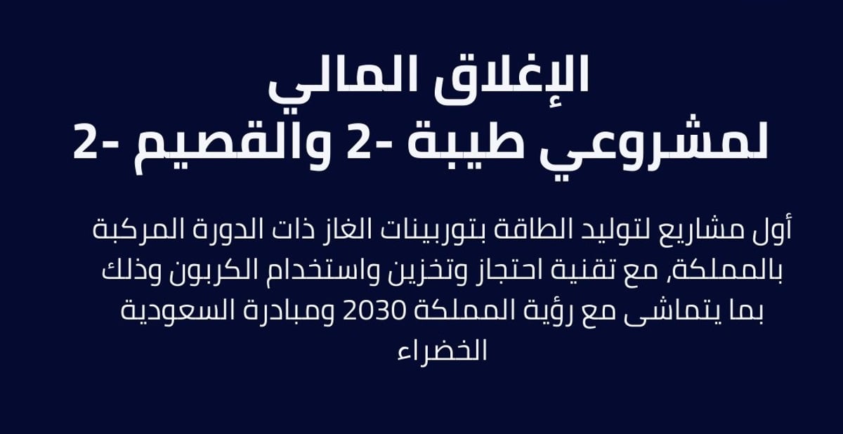 نجاح الإغلاق المالي لمشروعي "طيبة 2" و"القصيم 2" لإنتاج الطاقة الكهربائية بسعة إجمالية تبلغ 3.96 جيجاواط